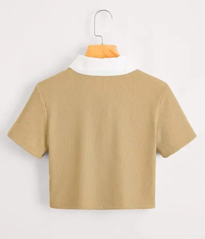 Sweet, soft, and seriously stylish! This beige ribbed crop top features a charming teddy bear embroidery and a crisp white collar that adds a preppy twist to your casual looks.